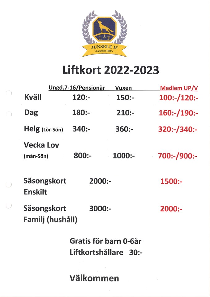 LIftkortspriser 2022-2023 Junsele IF 6 dec 2022 0kommentarer