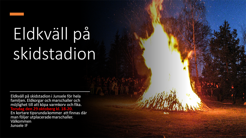 Eldkväll på skidstadion i Junsele för hela familjen. Eldkorgar och marschaller och möjlighet till att köpa varm korv och fika. TORSDAG den 29 oktober kl. 18-20. En kortare tipsrunda kommer att finnas där, man följer utplacerade marschaller. VÄLKOMMEN Junsele IF Junsele IF 22 okt 2020 0kommentarer