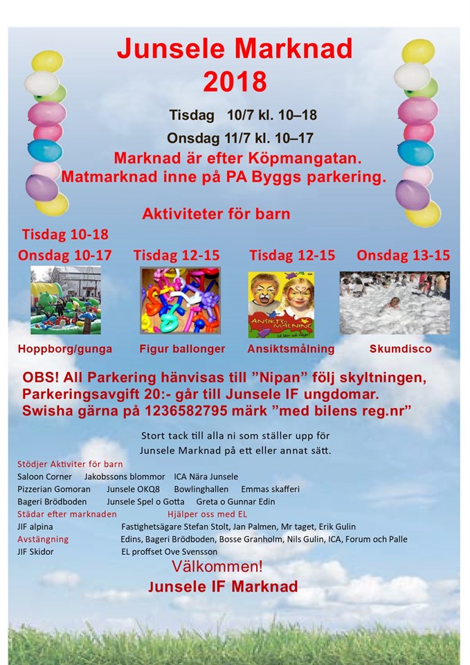 Tisdag 10/7 kl. 10–18 Onsdag 11/7 kl. 10–17 Marknad är efter Köpmangatan. Matmarknad inne på PA Byggs parkering. Aktiviteter för barn Tisdag 10-18 Onsdag 10-17 Hoppborg/gunga Tisdag 12-15 Figur ballonger, Ansiktsmålning Onsdag 13-15 Skumdisco OBS! All Parkering hänvisas till ”Nipan” följ skyltningen, Parkeringsavgift 20:- går till Junsele IF ungdomar. Swisha gärna på 1236582795 märk ”med bilens reg.nr”