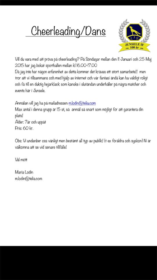 Hej! Då inte alla gillar att spela fotboll tänkte jag att det vore roligt att se ifall det finns något intresse för cheerlaeding/ dans. Visst vore det roligt med en egen underhållande hejaklack!? Vi kör igång efter jul, men vill ha anmälan så snart som möjligt då jag har begränsat antalet. Se mer under Dokument. (Huvudmapp) Med vänliga hälsningar Maria Lodin